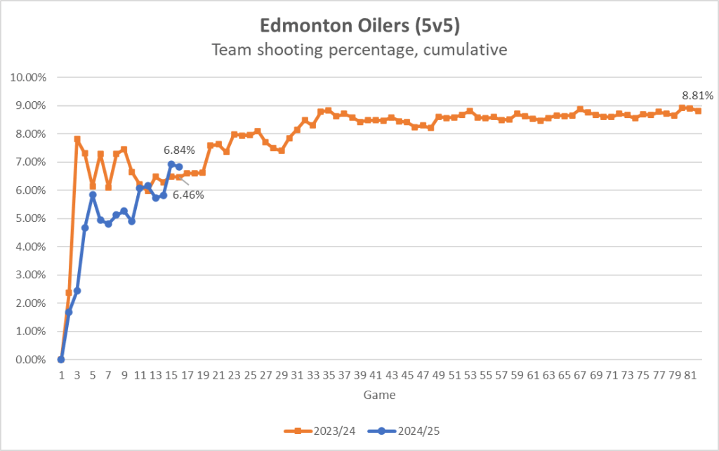 Below is a graph showing the Oilers cumulative shooting percentage over the course of last season (orange line). It took them a while to get going, but they finished the regular season well. And the shorter blue line represents the Oilers cumulative shooting percentage for the current regular season.
