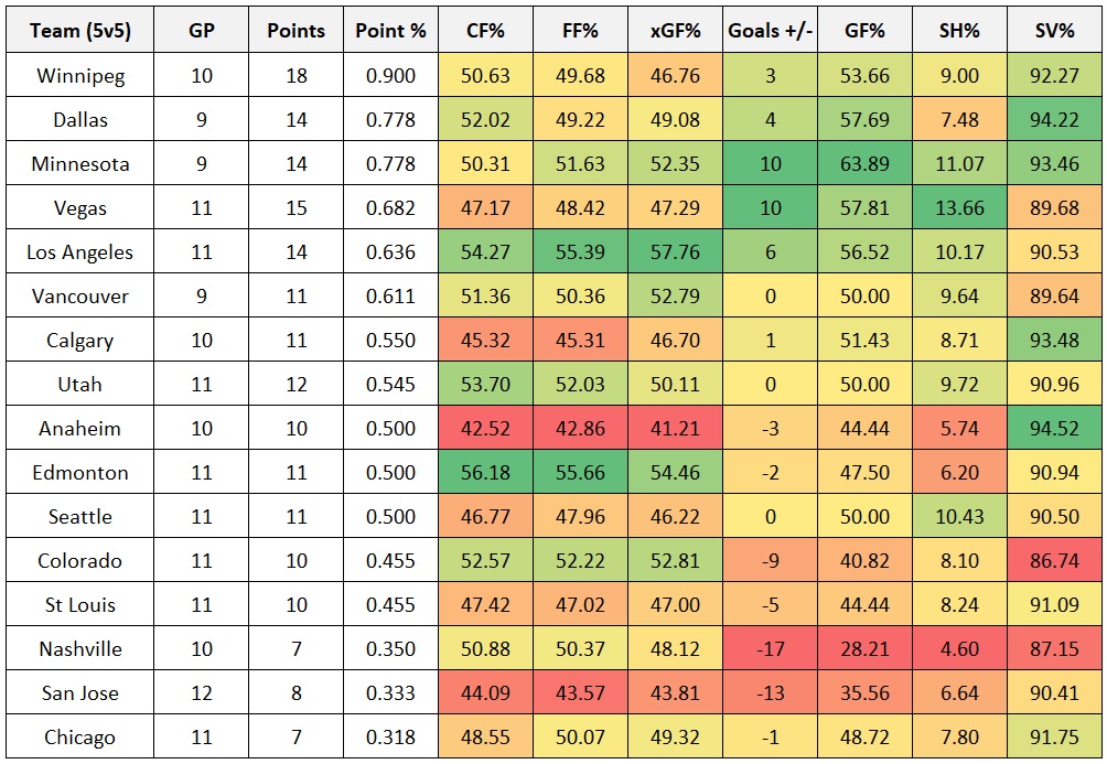 I’d expect teams like Anaheim, San Jose, Seattle, Calgary and St. Louis to gradually drop in the standings. And it’ll be interesting to see where Vegas lands, as they have the talent but don’t appear to have sustainable results. They’re currently posting some poor shot-share numbers, and their results appear to be driven by a higher than normal shooting percentage.