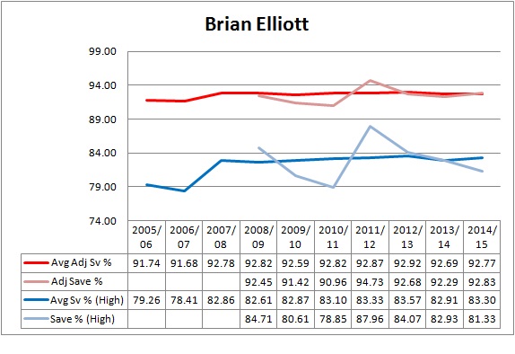 To make a case, I first looked at how he measures up against the average adjusted save percentage (at even-strength) among goalies who played 20 or more games. And secondly, I looked for other goalies who may have had a rough season (or two) and bounced back.