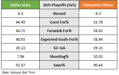 Expecting an entertaining western conference final. Here’s how the two teams match up at even-strength. Dallas has relied heavily on goaltending and special teams to keep things going so far this post-season, and it’ll be interesting to see if Skinner can match (or at least get close to) Oettinger’s level this round.