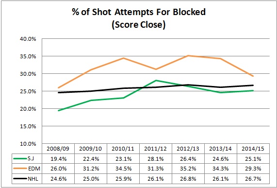 The Sharks were very good at not only generating shot attempts, regardless of the score, but also blocking shots. That indicates to me that they they didn’t let the opposition set up plays as often as other teams, thanks in small part to their effective forecheck. What’s become obvious is how much pressure they apply to puck carriers and position themselves to take away the options when they don’t have the puck. I think this will be the most difficult tactic to implement for McLellan.