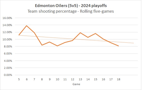The only time the Oilers were a threat against the Panthers at even-strength was when McDavid and Draisaitl were on the ice together. They played 70 minutes (about 20 percent of the Oilers total time) and posted a Corsi For percentage of 59 percent and an Expected Goals for percentage of 57 percent – indicating that the Oilers controlled the flow of play and scoring chances. The issue was that they could not finish their chances, scoring only one goal and allowing five against (a goal-share of 16 percent). That’s far below the results we would expect from the top two players in the world, but that’s how things can go in a short tournament.
