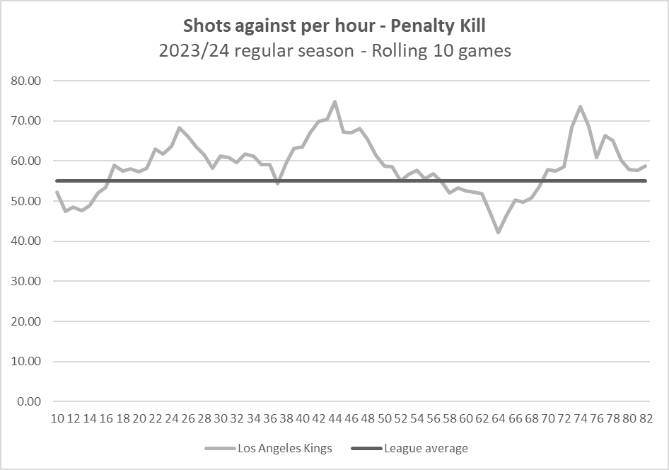 Here’s a quick look at the Kings rate of shots against per hour over the course of the regular season, broken out by rolling ten-game segments. The blue line across represents the league-average rate of shots against (55.05 per hour).