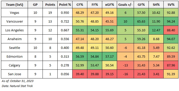 It was a rough start to the 2023/24 regular season for the Edmonton Oilers, who currently rank sixth in the Pacific division with a 0.313 points percentage and 30th in the league – only ahead of Calgary and San Jose. And with Seattle sitting 27th, four of the bottom six teams in the league are currently from the Pacific. On the other end of the standings, Vegas, Vancouver, and Los Angeles have had good starts to their seasons, banking points early and often.