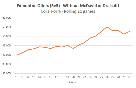 So based on some quick and dirty math – had the Oilers goalies performed at the same levels they had in the previous three seasons, the team would have allowed 77 goals instead of 80 at even-strength (5v5). Using the same number of shots against, that would be a team save percentage of 0.912 and would rank 26th in the league instead of 29th. So as much as the Oilers would like their goalies to be closer to league average levels at even-strength, it’s really not a realistic expectation considering how Smith and Koskinen have performed below league average over the last three seasons. Holland and his group should have known this heading into such an important season.