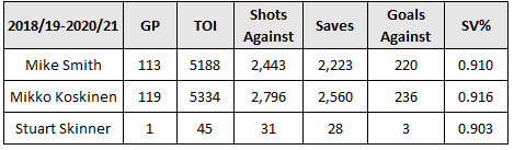 In the same three-year period, Koskinen didn’t fare much better posting a 0.916 save percentage in 119 games, sitting just below league average and ranking 42nd among the same group of 60 goalies. He’s definitely been worse this season posting a 0.906 save percentage, which is somewhat expected considering he’s now 33 years old and taking on a larger workload with Smith being injured. Skinner had only played one NHL game in that three-year period, but it’s good to know that his 0.913 save percentage this season would rank 48th among those 60 goalies.